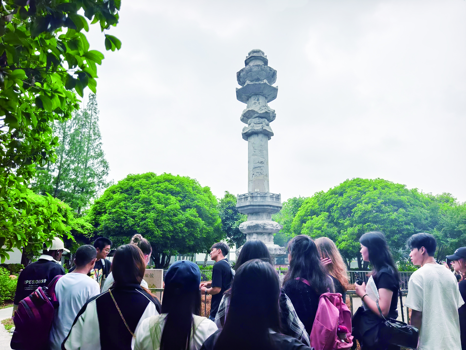 从地铁9号线醉白池站登程,在资深城市考古讲师松松的指示下,留学生“体验官”们沿着东说念主民北路、中山中路等老城街巷信步而行。他们或是东跑西奔,探索阔街、黑鱼弄等弄堂深处的历史古迹,或是移步打卡,从文化和历史层面了解唐经幢、云间第一楼、方塔、照壁等历史文物成就背后鲜为东说念主知的陈年旧事以及文脉底蕴,千里浸式恍悟松江深厚的历史东说念主文。