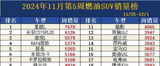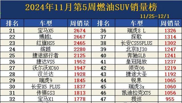导读:日前汽车之家公布了11月终末一周燃油SUV的销量榜单,燃油SUV销售体量如故广宽,在前50名车型中,周销不及千辆的仅有4款车型,有7款车型销量跳跃五千辆,其中就包括途不雅L,RAV4荣放,本田CR-V等经典燃油车型,星越L和长安CS75PLUS这两款国产车型排在榜单前两位,而除了这两款以外瑞虎8也干预榜单前10名,疾驰GLC,良马X3,奥迪Q5L这三款豪车的代表名次皆相比靠前,反不雅马自达CX-5,途昂这些市集上相比冷门的车型,周销量还不及千辆,竟然有点惨。太惨!11月终末周燃油SUV销量:星越L夺冠,CR-V第6,哈弗H6第17