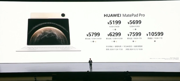 新款华为MatePad Pro 13.2英寸:12GB+256GB售价为5199元、12GB+512GB售价为5699元、柔光版12GB+256GB售价为5799元、柔光版12GB+512GB售价为6299元、柔光版16GB+1TB售价为7599元、典藏版16GB+1TB售价为10599元。