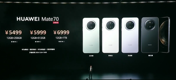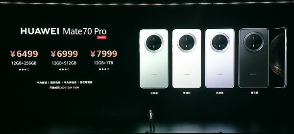 华为Mate70:12+256GB售价为5499元、12+512GB售价为5999元、12+1TB售价为6999元。