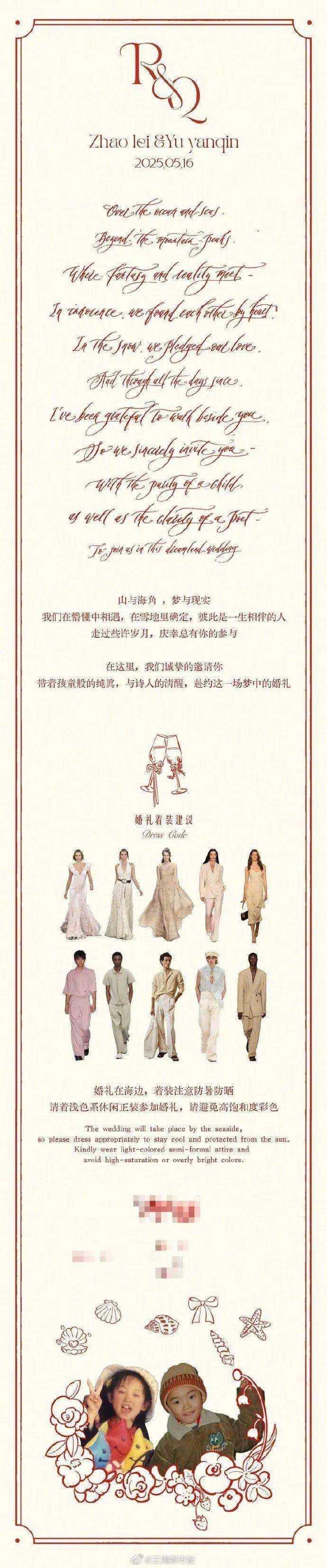 4月21日,X玖少年团成员赵磊婚典邀请函曝光,将于5月16日在海边举行婚典。