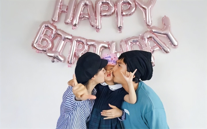 每年诞辰,配偶俩都会驾驭夹攻,把对儿子满满的爱意化作亲吻,印在小花的脸上。