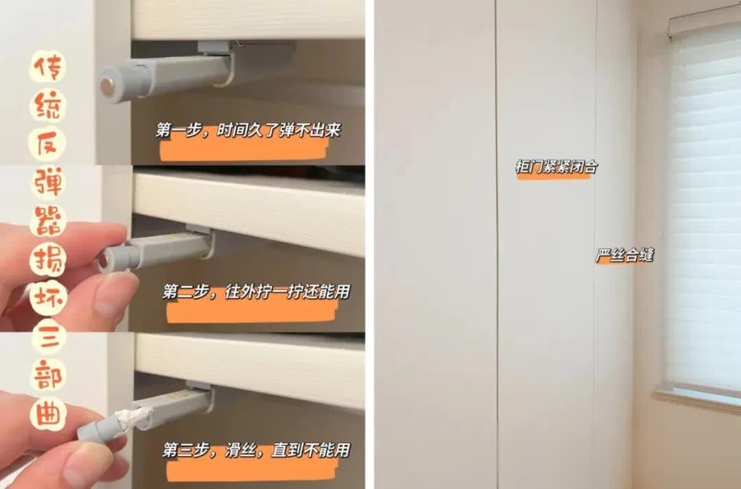 补助主义:找到反弹器上的调理旋钮(一般有箭头指点),往左拧是伸长,往右拧是独揽。关不上门大多是因为反弹器行程太长,往右拧半圈,再试关门就会发现顺畅多了。要是还是不能,就在柜门交游反弹器的位置贴一小块毛毡,减少撞击力,能蔓延使用寿命。