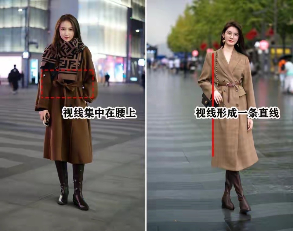 莫得自带腰带的情况下,我们不错收受皮质的棕色细腰带来点缀,这么也能很好的普及腰线,何况我们收受的大衣外衣尽量要有垂坠感,这么视觉才能酿成一条直线,这么能让你的体魄线条变得更畅达。