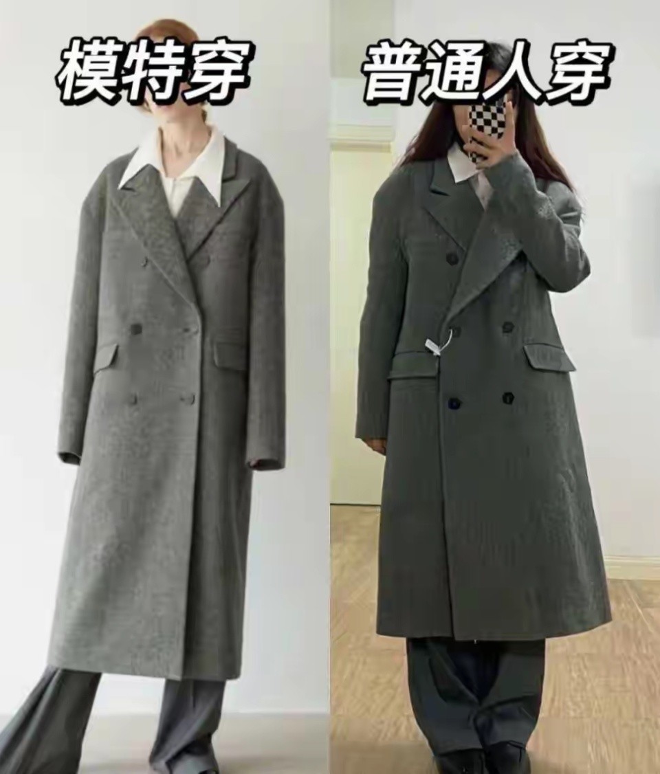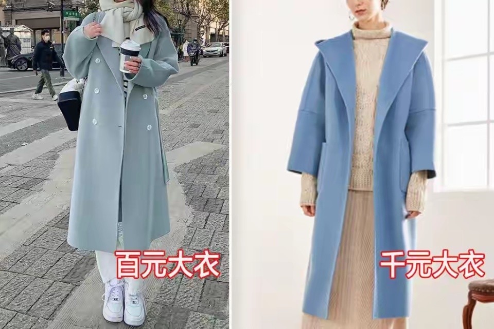 就底下这两件一稔对比,从神采上我们就不错看得出差距,百元的大衣外衣神采莫得那么的隧谈,嗅觉有点灰蒙蒙的。
