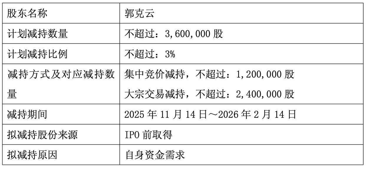 公告泄露,郭克云通过齐集竞价神色及巨额来往神色减执其所执有的公司股份不起先360万股,即不起先公司总股本的3%。减执本事自公告透露之日起15个来当年后的三个月内进行,减执价钱按阛阓价钱细则。